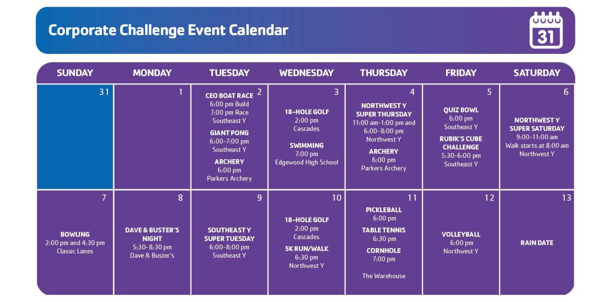 We offer a wide variety of events during Corporate Challenge! Employees can choose from over 30 unique activities to participate in, opting into just a few or all events. Please note that each event has a participation fee per employee—refer to our Official Entry Form for a full breakdown of event descriptions and participation fees.